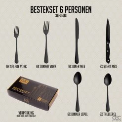 OEC Kitchen Bestekset 36-delig – Zwart – 6 Persoons – Steakmessen – Messen – Vorken – Lepels – RVS