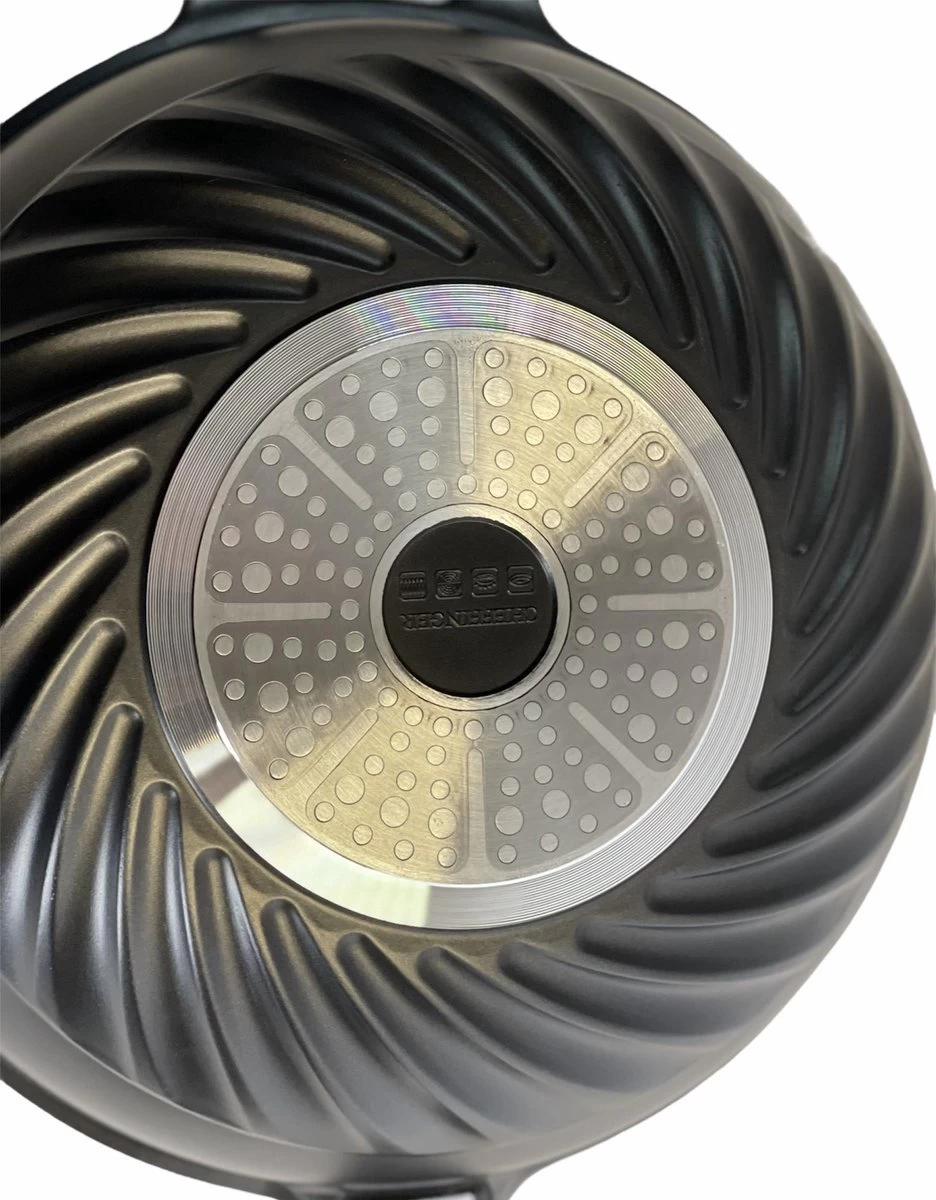 De pan is gemaakt van gesmeed aluminium en heeft een 3-laags marmeren coating.