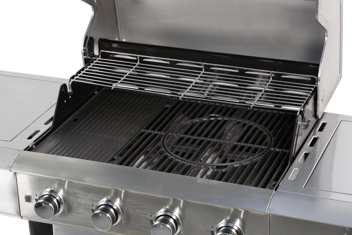 – Het grillopvervlak is voorzien van gietijzeren roosters en een gietijzeren bakplaat. De roosters bieden een mogelijkheid om een pizzasteen te gebruiken.